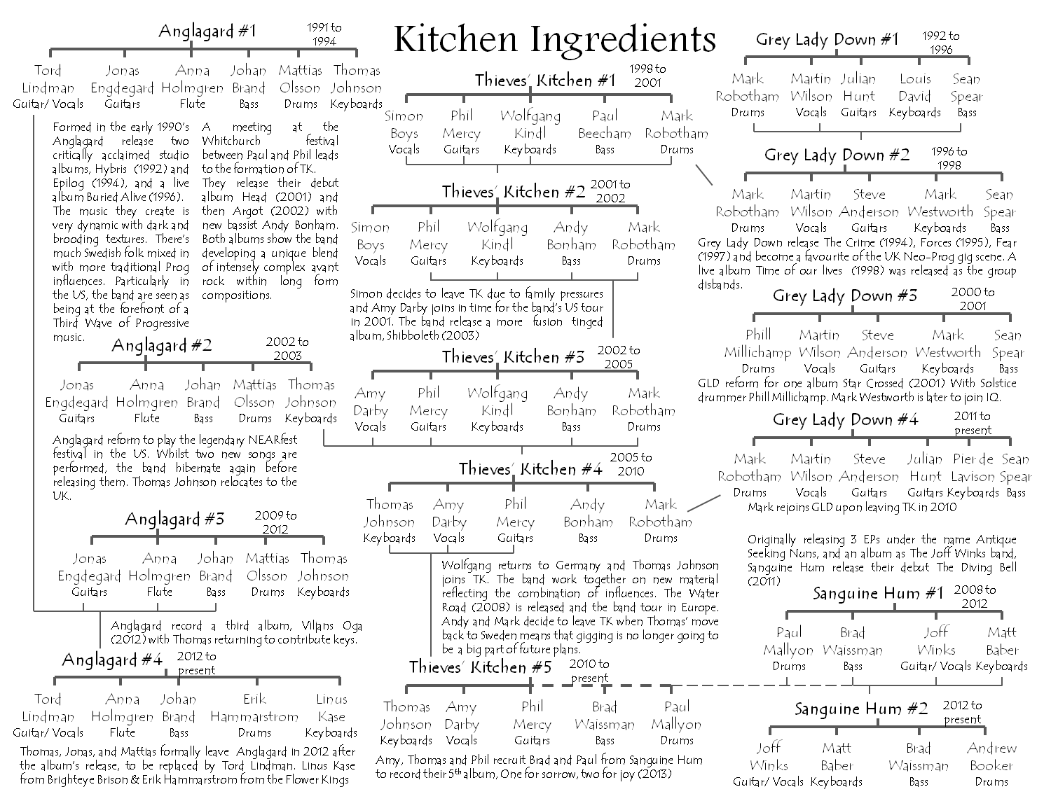 Like us, many of you might have fond memories of spending many an hour poring over the rock family tree diagrams to see which musicians had played with which bands … so, with this in mind, here’s the Thieves’ Kitchen rock family tree.